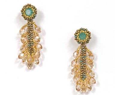 Crystal Plume earrings were inspired by fancy feathers of ages gone by. Feathers were a popular component in women’s attire, hats and accessories. Crystal Plume Earrings takes them to the next level using Swarovski briolettes to create sparkling plumes. The option to make them dangle or sit high on the ear is up to you; simply select the finding you like best - the ear nut and post or the French ear wire. Herringbone, fringe and peyote are the main stitches used to create a bezel, casing and plume dangle. The bezeled stone is an 8mm deep faceted Swarovski chaton.
